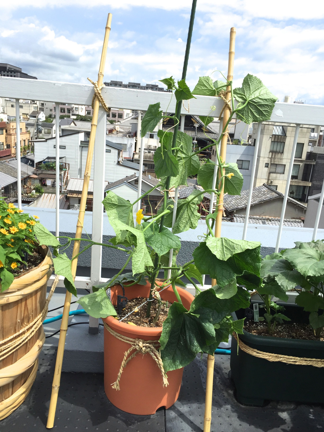 上に伸び上がらずに低い位置でジャングルのようになっていたキュウリ